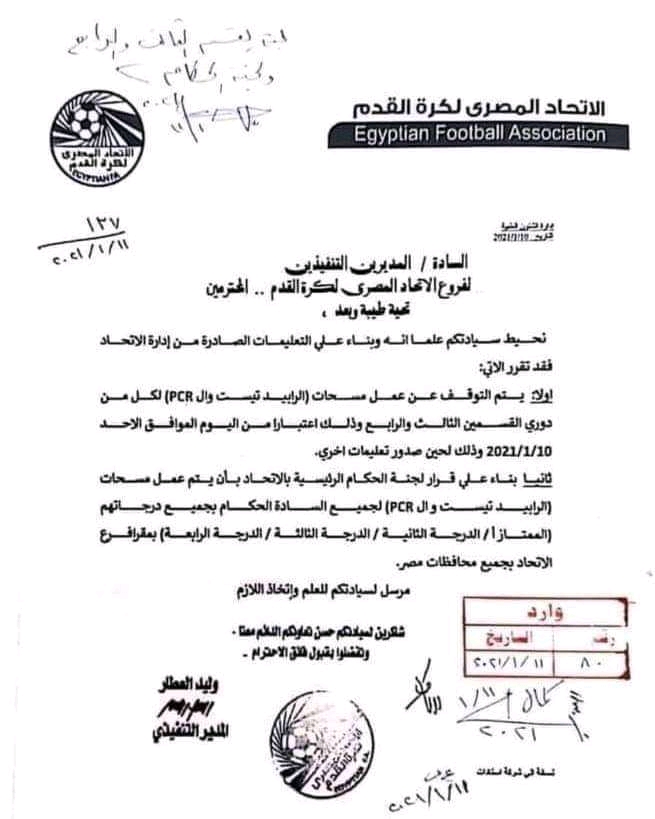 قررت اللجنة الثلاثية بالاتحاد المصري لكرة القدم برئاسة احمد مجاهد في بيان رسمي إيقاف عمل مسحات فيروس كورونا(الرابيد تيست وPCR)لكلا من دوري القسمين الثالث والرابع، كما اشار البيان الي عمل المسحات للطاقم التحكيمي في كل المسابقات الكروية(الممتاز أ،الدرجة الثانية،والثالثة،والرابعة)، وصرح مصدر مسؤول بأن قرار اللجنة بعدم اجراء مسحات للقسمين الثالث والرابع تجنبا للنفقات المادية التي تكلفها المسحات، وتابع المصدر انه في حالة تدهور الاوضاع بين اللاعبين ستعود اللجنة الثلاثية في قرارها وتجري المسحات للاعبين والاطقم الطبية والفنية، واضاف المصدر ان اجراء المسحات للطاقم التحكيمي في كل المسابقات جاء بسبب حرص مسؤولي الجبلاية من عدم انتشار الفيروس،وقال خبير رياضي بارز ان ما يحدث من اللجنة الثلاثية يعد عبثا وانه يجب ان تكون المسحات للجميع دون استثناء،واستطرد انه في حالة حدوث اي ضرر للاعب او مدير فني من سيتحمل المسؤولية.