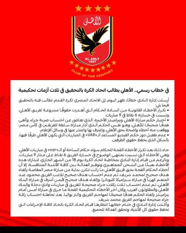 أرسل النادي الأهلي خطاب رسمي إلى الإتحاد المصري لكرة القدم يطالب فيه بالتحقيق في ثلاث أزمات وأخطاء تحكيمية.