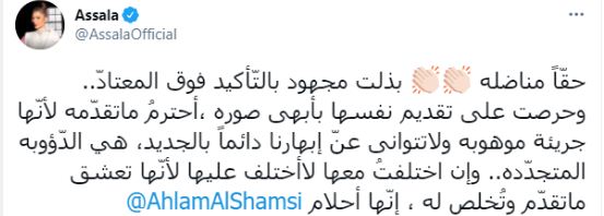 هنأت النجمة السورية أصالة نصرى، صديقتها الفنانة أحلام على عودتها للساحة الغنائية بعد غياب أربع سنوات بإصدار ألبوم غنائي جديد يحمل عنوان "فدوة عيونك"، ووجهت رسالة لها عبر حسابها الرسمي بموقع "تويتر"، قائلة: "حقّاً مناضله بذلت مجهود بالتّأكيد فوق المعتادّ.. وحرصت على تقديم نفسها بأبهى صوره أحترمُ ما تقدّمه لأنّها جريئة موهوبة.. ولا تتوانى عنّ إبهارنا دائماً بالجديد، هي الدئوبة المتجدّدة.. وإن اختلفتُ معها لا أختلف عليها لأنّها تعشق ماتقدّم وتُخلص له، إنّها أحلام".