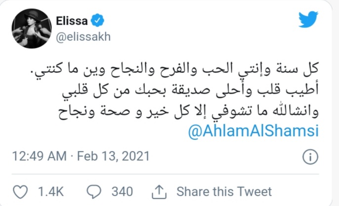 قامت الفنانة اللبنانية " إليسا " بتقديم معايدة للفنانة الإماراتية " أحلام " وذلك بمناسبة عيد ميلادها الذي يوافق 13 من شهر فبراير ، موضحة حبها الشديد لها برفقتها كما تعد أفضل أصدقائها ، حيث كتبت بوست على صفحتها الخاصة عبر مواقع التواصل الإجتماعي قائلة : " كل سنة وإنتي الحب والفرح والنجاح وين ما كنتي. أطيب قلب وأحلى صديقة بحبك من كل قلبي وانشالله ما تشوفي إلا كل خير و صحة ونجاح " .