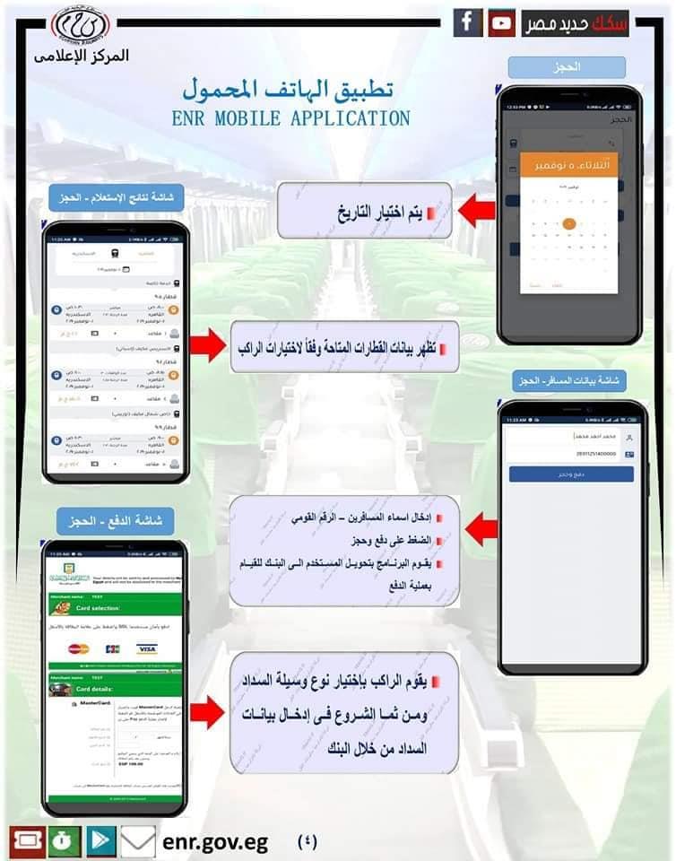 شاركت هيئة السكة الحديد المواطنين كيفية حجز التذاكر الخاصة بالقطارات العادية والمميزة والمطورة والروسية، وذلك عن طريق أبلكيشن يتم تحميله على الهاتف المحمول.