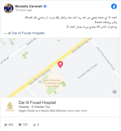 ونشر الفنان مصطفى درويش، منشوراً عبر حسابه الرسمي على فيسبوك، قال فيه: «الحمد لله أي حاجة بتيجي من عند ربنا الف حمد وشكر ليك يارب انا راضي بكل قضائك.. وثمن وبندفعه الحمدلله وبدعوات الناس كله بيعدي وربنا بيستر الحمد لله».