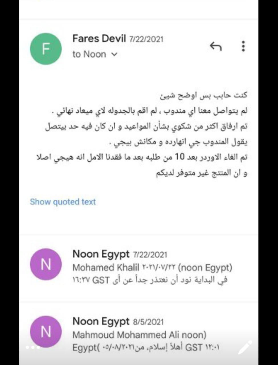قدّم إسلام شكواه للشركة، وبدأت زوجته في التواصل مع فرع نون بمصر، وبعد نحو 10 أيام؛ تم إبلاغهم بإلغاء الطلب، وسيتم رد المبلغ لحسابه مرة أخرى، لكن مر أكثر من شهرين على التواصل عبر الميل، دون رد أو استرداد المبلغ.