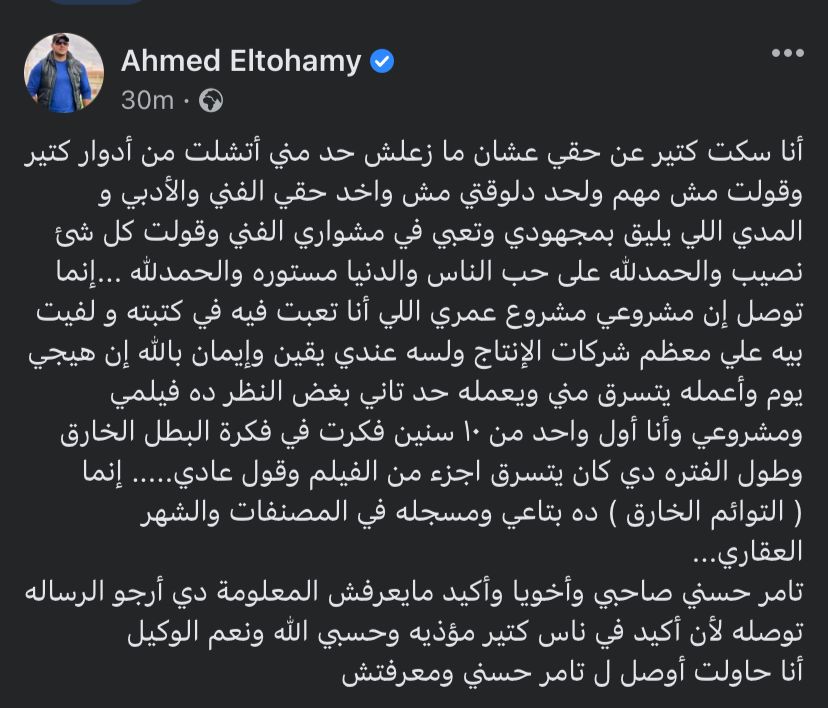 أحمد التهامي يهاجم صناع فيلم تاج لـ تامر حسني: مشروع عمري اتسرق ومسجله في الشهر العقاري
