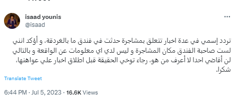 وكتبت إسعاد يونس عبر حسابها بموقع تويتر: تردد اسمي في عدة اخبار تتعلق بمشاجرة حدثت في فندق ما بالغردقة، وأؤكد أنني لست صاحبة الفندق مكان المشاجرة وليس لدي أي معلومات عن الواقعة، وبالتالي لن أقاضي أحدا لا أعرف من هو، رجاء توخي الحقيقة قبل إطلاق أخبار على عواهنها، شكرا.