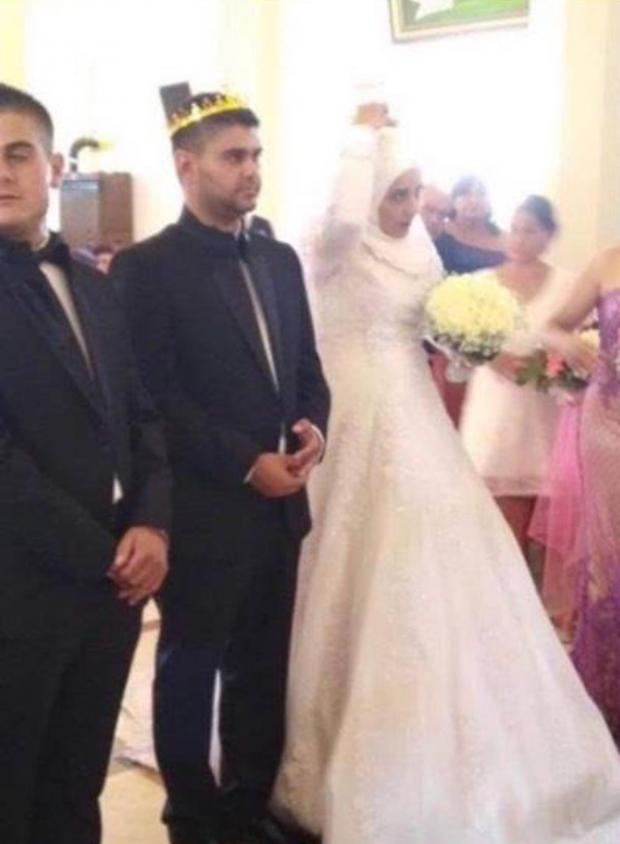 وظهرت العروس مرتدية الحجاب، في حفل زفافها داخل الكنيسة، وبحسب صحيفة النهار اللبنانية، حصلت العروس على الموافقة من مرجعها الديني، كما حصل العريس أيضًا على موافقة المطران الكاثوليكي، وتمت الزيجة بشكل طبيعي، لكن العروسان اضطرا وقتها للسفر إلى قبرص، لتثبيت زواجهما مدنيا.