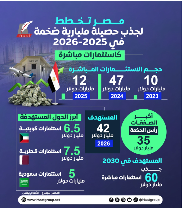 ووفق إنفوجراف لمؤسسة "ماعت جروب" تستهدف القاهرة جذب 42 مليار دولار خلال العام المالي 2025-2026، والوصول إلى 60 مليار دولار بنهاية 2030.