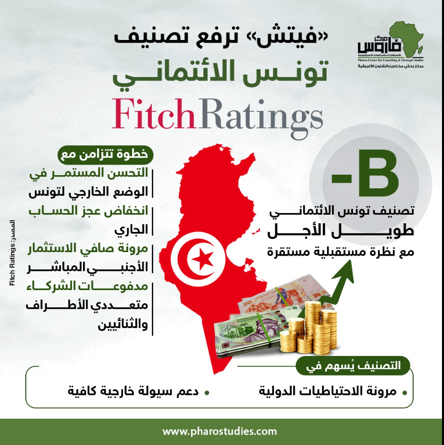 رفعت وكالة فيتش للتصنيف الائتماني، تصنيف تونس إلى مستوى "B-" مع نظرة مستقبلية مستقرة، وهو التصنيف الذي يعكس تحسناً في الوضع الخارجي لتونس مع انخفاض عجز حساب المعاملات الجارية ومرونة صافي استثمار رأس المال الأجنبي المباشر، وفق إنفوجراف لـ"مركز فاروس للدراسات الاستراتيجية والسياسات".