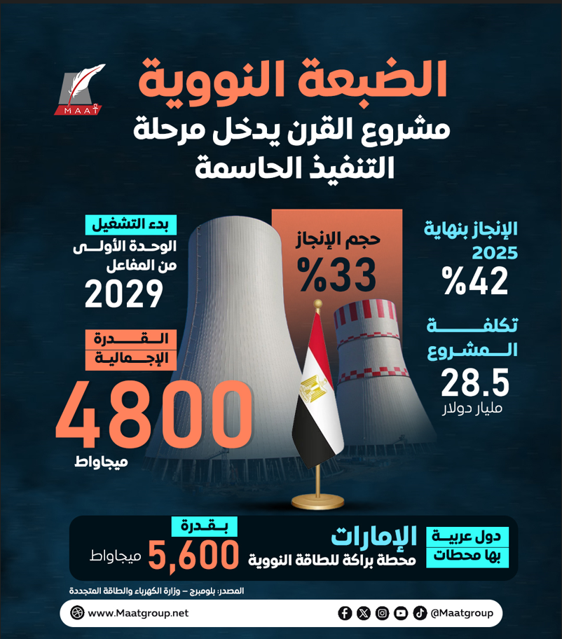 ووفق إنفوجراف لمؤسسة "ماعت جروب" تستهدف مصر رفع نسبة الإنجاز في أعمال بناء المحطة إلى 42% بنهاية العام الجاري، مع بدء تشغيل الوحدة الأولى للمفاعل النووي في عام 2029.
