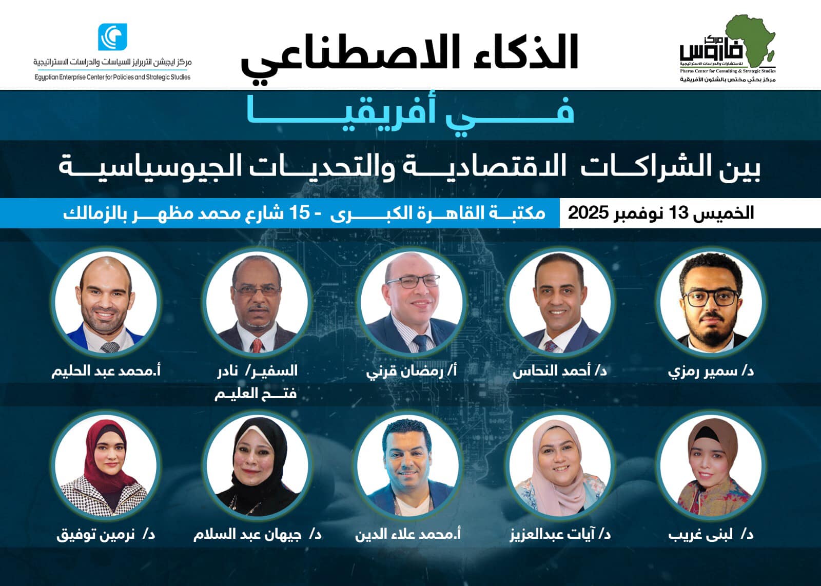 ينظم مركز إيجبشن إنتربرايز للسياسات والدراسات الاستراتيجية ، بالتعاون مع مركز فاروس للاستشارات والدراسات الاستراتيجية، ورشة عمل بعنوان: الذكاء الاصطناعي في إفريقيا: بين الشراكات الاقتصادية والتحديات الجيوسياسية.