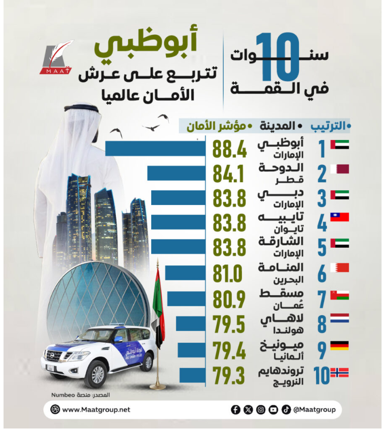 أبوظبي تتصدر قائمة المدن الأكثر أمانا عالميا للعام العاشر | إنفوجراف لـ”ماعت”