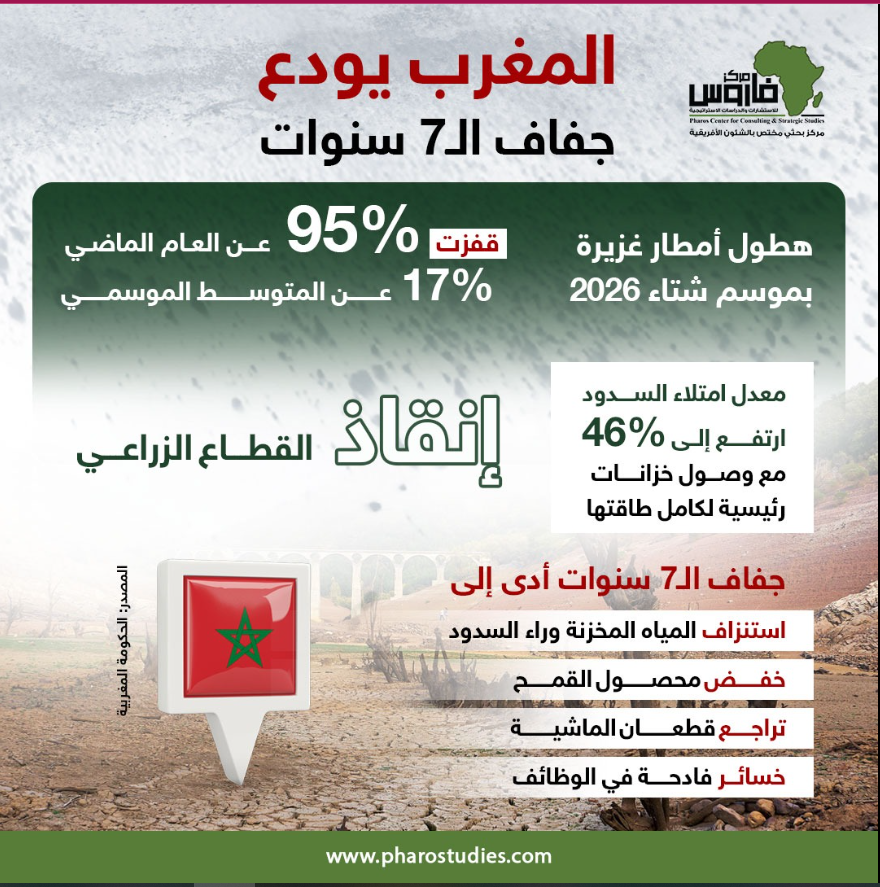 المغرب يعلن نهاية الجفاف ونسبة امتلاء السدود 46%  | إنفوجراف لـ”مركز فاروس”