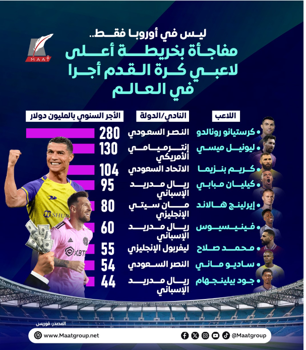 رونالدو يتصدر أعلى لاعبي كرة القدم أجرا.. وصلاح بالقائمة | إنفوجراف لـ”ماعت”