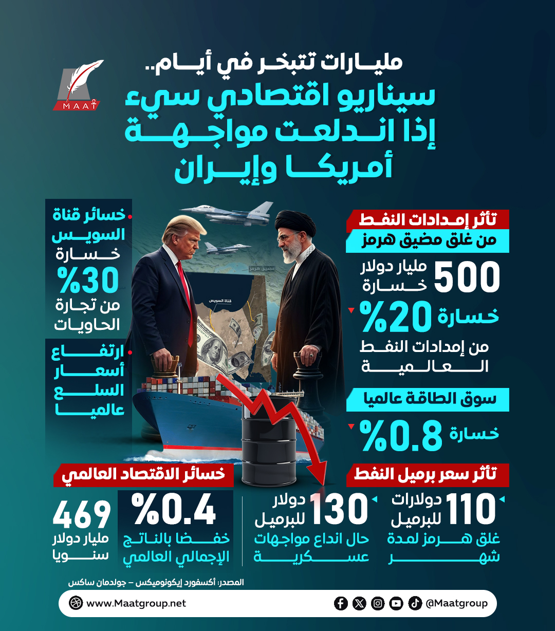 ”ماعت” خسائر باهظة الاقتصاد العالمي حال مواجهة عسكرية بين أمريكا وإيران | إنفوجراف