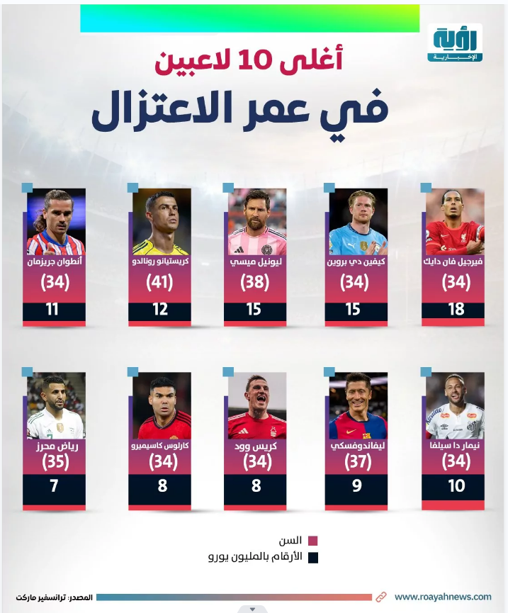 أغلى 10 لاعبين في عمر الاعتزال | إنفوجراف لـ”رؤية”