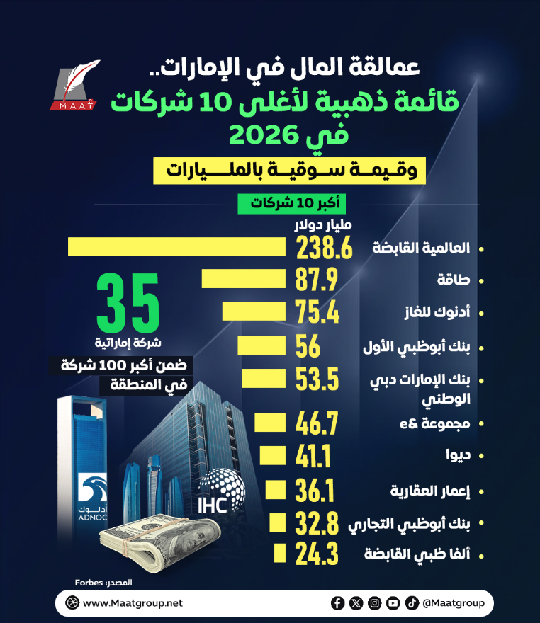 ضمت دولة الإمارات 35 شركة بقائمة أكبر 100 شركة عامة من حيث القيمة السوقية في الشرق الأوسط لعام 2026.